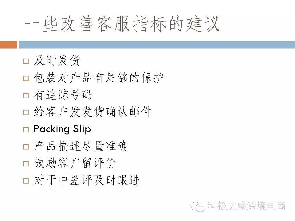 刚才讲了一下亚马逊是如何在各个卖家分配Buy box的,接下来讲一下对于卖家来说怎么做占有更多的Buy box,从实际操作中来做。很多因素是跟你的售后质量和客服质量相关的,这是亚马逊非常强调的客户客户体验要非常好,要及时发货,包装要好,对于产品有足够的保护,有效降低退货率,要有跟踪号码,给客户发了货要发确认邮件,国外的客户,还写了箱子里有什么东西,产品描述尽量准确,用户买到之后,拿到产品的时候可以鼓励客户给你评价,这样可以提高好评率。你得到中评和差评的话,要快速地跟进,这是改善客服指标的建议。