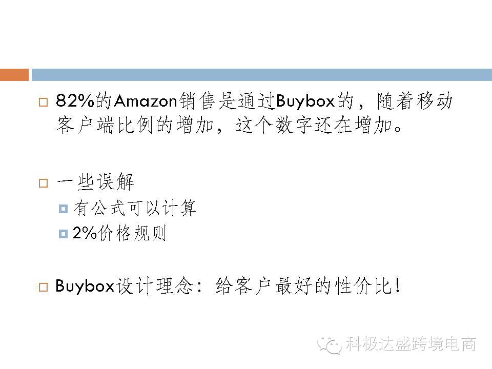 在Buy box上,因为算法对于亚马逊来说是属于机密,不想公开给所有的人,要不然大家会去想怎么利用这个规则,大家有各种各样的猜测,其中一些猜测是不太正确的,有一些误解说是有公式可以算的,如果把这个公式搞清楚,我们可以永远占领Buy box,这个是不对的,还有一个是有2%的价格规则,目前Buy box的价格只要在它的2%的范围内,我就已经占了2%,这个有一点正确,但是不太正确,我可以猜测它大概是怎么算的。