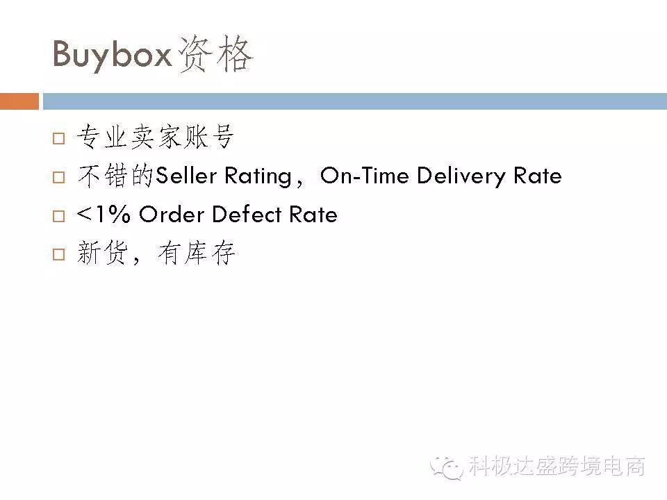我写的一个禁区,如果这几个方面有一个达到了,你根本进不了Buy box,比如发货时间很长,如果有一项特别差,你就拿不到Buy box。