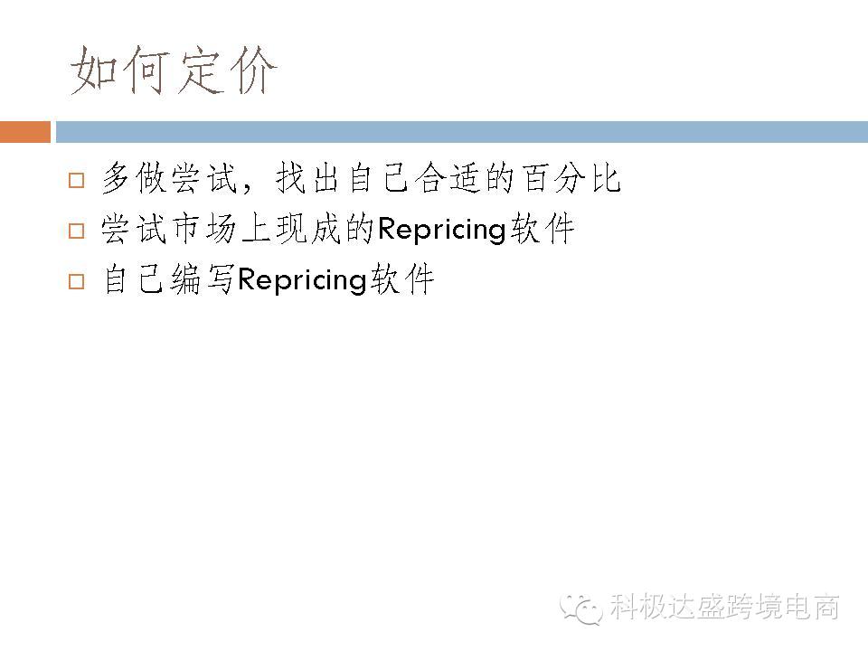 第二个重点要攻克的是价格,如何定价。有一些误区,至于2%的规则这些都不完全准确,要多做一些尝试,每个卖家有每个卖家自己的评分,根据评分,你对于不同的产品页面可以占有多少的Buy box,我很难有一个明确的说法,所以还是要自己多做一些尝试,找出适合自己百分比是怎样的。市场上有一些软件,有一定的智能,给你设定一定的规则,会想办法给你尽可能多的Buy box,当然这些软件也各有优缺点,我相信还是有一些用处的,这样的软件也是比较多,可以去做一些尝试。如果你们的IT部门足够强大话,可以编制自己的软件,这样主动性更强了,你想把规则写成什么样就是什么样。