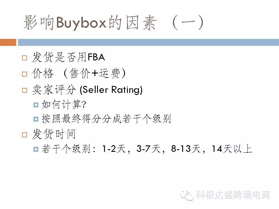 每个因素从上到下是按照重要的顺序来排的,我们猜测的权重的按数据,关键是是否要用亚马逊的发货方式,你把货放在亚马逊的仓库,亚马逊的仓库帮你做,你用了FBA,无形之中比其他卖家大了权力占领Buy box。