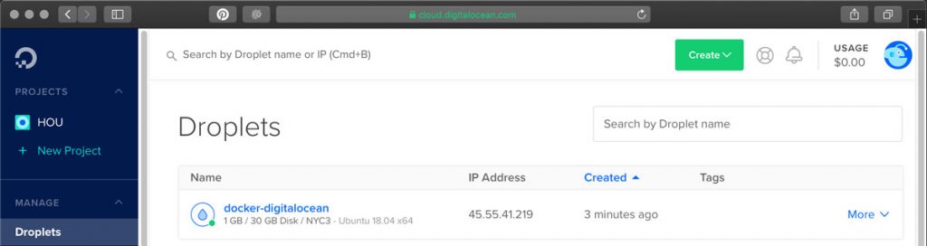 Running pre-create checks... Creating machine... (docker-digitalocean) Creating SSH key... (docker-digitalocean) Creating Digital Ocean droplet... (docker-digitalocean) Waiting for IP address to be assigned to the Droplet... Waiting for machine to be running, this may take a few minutes... Detecting operating system of created instance... Waiting for SSH to be available... Detecting the provisioner... Provisioning with ubuntu(systemd)... Installing Docker... Copying certs to the local machine directory... Copying certs to the remote machine... Setting Docker configuration on the remote daemon... Checking connection to Docker... Docker is up and running! To see how to connect your Docker Client to the Docker Engine running on this virtual machine, run: docker-machine env docker-digitalocean |