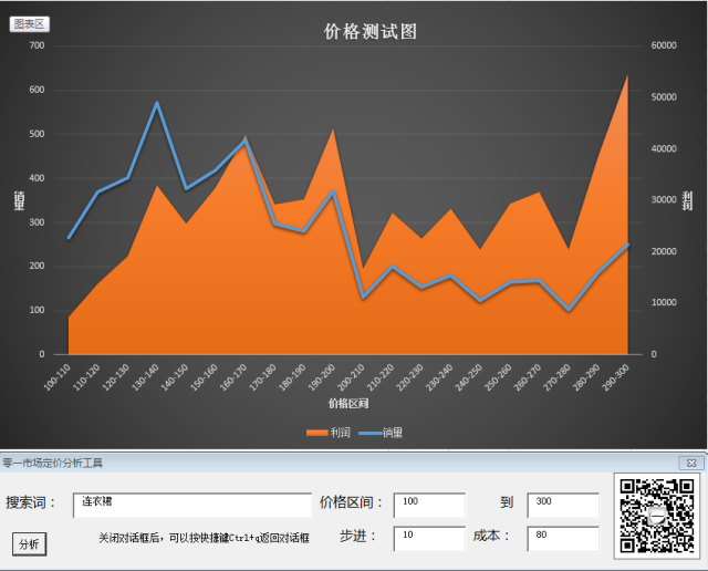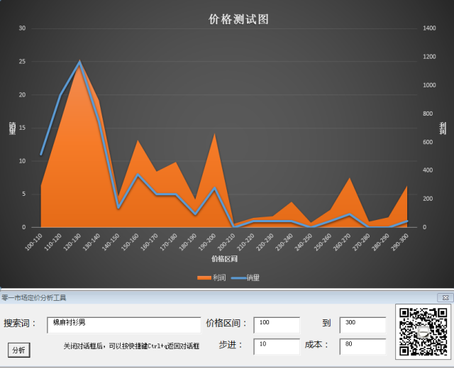 对于结果,我并不看具体数字,因为调了下算法,结果是相对靠谱也适合大部分人用,所以会偏低的,看图形就好了,一件80块钱的衣服,定价最高是这件衣服的4倍,但我前面也说了,价格要依靠价值感来承载。从图形上看,最优选择是[150,200]和[290,300]这两个区间,利润最大化。
