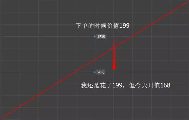 前2天我在你的淘宝店买了件衣服199元,今天收到货爬上来确认收货,却发现尼玛的今天这件衣服只要168元,这个时候,就万马奔腾了,我的心理是这样的:下单的时候这件衣服价值199,但今天,我已经花了199,今天只值168,价值区间向下移动