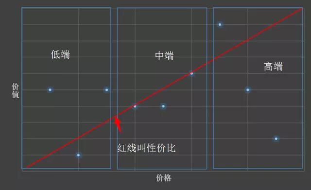 当价值大于价格的时候,也就是落点在红线上方,买家就会感觉到物超所值。反过来,当价格大于价值的时候,也就是落点在红线下方,买家就会感到被坑了。图中的红线,就是性价比。
